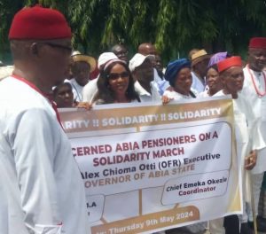 Pensioners under the aiges of Concerned Abia Pensioners (CAP) had during the week staged a solidarity match , moving round major streets in the State Capital, Umuahia with solidarity songs and praises to God for given Abia a governor like Dr Alex Otti who has come to their rescue to end their many years of sufferings in the hands of the previous administrations.